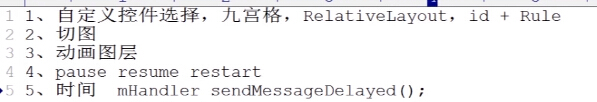 {// 默认3*3的碎片private int mColumn = 3;// 容器的内边距private int mPadding;// 每张小图之间的距离,横纵。dpprivate int mMargin = 3;// 每一张小图位置上的那个viewprivate ImageView[] mGamePintuItems;// 每一张小图的宽度。private int mItemWidth;// 游戏的图片。private Bitmap mBitmap;// 存放所有的图片碎片的list。private List<ImagePiece> mItemBitmaps;// 操作一次的标识。private boolean once;// 游戏面板的宽度,容器的宽度private int mWidth;private boolean isGameSuccess;private boolean isGameOver;// 设置接口通知MainActivity进行回调。这三个函数是在MainActivity中进行实现的。这里提供的只是一个接口。public interface GamePintuListener{void nextLevel(int nextLevel);void timechanged(int currentTime);void gameover();}// 接口成员变量。public GamePintuListener mListener;/*** 设置接口回调* * @param mListener*/public void setOnGamePintuListener(GamePintuListener mListener){this.mListener = mListener;}private int mLevel = 1;private static final int TIME_CHANGED = 0x110;private static final int NEXT_LEVEL = 0x111;/** 进行UI操作。* */private Handler mHandler = new Handler(){public void handleMessage(android.os.Message msg){switch (msg.what){case TIME_CHANGED:// 如果游戏成功、失败、停止,停止计时。if (isGameSuccess || isGameOver || isPause)return;if (mListener != null){mListener.timechanged(mTime);}if (mTime == 0){isGameOver = true;mListener.gameover();return;}mTime--;// 每一秒发送一次减少。mHandler.sendEmptyMessageDelayed(TIME_CHANGED, 1000);break;case NEXT_LEVEL:mLevel = mLevel + 1;// 这个是判断用户是否选择进行下一关。if (mListener != null){mListener.nextLevel(mLevel);} else{nextLevel();}break;}};};private boolean isTimeEnabled = false;private int mTime;/*** 设置是否开启时间* * @param isTimeEnabled*/public void setTimeEnabled(boolean isTimeEnabled){this.isTimeEnabled = isTimeEnabled;}/** 第一个构造方法调用第二个构造方法。* */public GamePintuLayout(Context context){this(context, null);}/** 第二个构造方法调用第三个构造方法。* */public GamePintuLayout(Context context, AttributeSet attrs){this(context, attrs, 0);}/** 第三个构造方法进行初始化。* */public GamePintuLayout(Context context, AttributeSet attrs, int defStyle){super(context, attrs, defStyle);init();}private void init(){/** 可以用TypedValue进行单位的转换,将dp转为px,或者将sp转为px* 这样也就把我们3dp转化为3px的值。* 在布局当中尽可能的所有的字体使用sp,所有的merage使用dp,一般不使用px,因为不同的屏幕上分辨率是不同的。* */mMargin = (int) TypedValue.applyDimension(TypedValue.COMPLEX_UNIT_DIP,3, getResources().getDisplayMetrics());// 保证上下左右边距相同的,取最小值mPadding = min(getPaddingLeft(), getPaddingRight(), getPaddingTop(),getPaddingBottom());}/** 设置当前布局的大小* */@Overrideprotected void onMeasure(int widthMeasureSpec, int heightMeasureSpec){super.onMeasure(widthMeasureSpec, heightMeasureSpec);// 取容器宽高的最小值。mWidth = Math.min(getMeasuredHeight(), getMeasuredWidth());// 如果once没有发生过。if (!once){// 进行切图以及排序。initBitmap();// 设置ImageView(Item)的宽高等属性。initItem();// 判断是否开启时间。checkTimeEnable();once = true;}// 重置它占据的位置是一个正方形。setMeasuredDimension(mWidth, mWidth);}/*** 判断是否开启时间。* */private void checkTimeEnable(){// 如果开启了,if (isTimeEnabled){// 根据关卡设置时间长短。countTimeBaseLevel();// 通知主界面显示时间。mHandler.sendEmptyMessage(TIME_CHANGED);}}// 根据关卡设置时间长短。private void countTimeBaseLevel(){// 用pow可以根据游戏难度增加时间,2的mLevel次,指数增长。mTime = (int) Math.pow(2, mLevel) * 60;}/*** 进行切图,已经排序。*/private void initBitmap(){if (mBitmap == null){// 获取Bitmap图片对象mBitmap = BitmapFactory.decodeResource(getResources(),R.drawable.image);}// 进行切割后返回ImagePiece的List。mItemBitmaps = ImageSplitterUtil.splitImage(mBitmap, mColumn);// 使用sort乱序排序图片。重写compare方法。Collections.sort(mItemBitmaps, new Comparator<ImagePiece>(){@Overridepublic int compare(ImagePiece a, ImagePiece b){// 使用随机数。return Math.random() > 0.5 ? 1 : -1;}});}/*** 设置ImageView(Item)的宽高等属性。*/private void initItem(){// 获取item宽度。(容器宽度-最左右的空隙-中间图片之间的空隙)/ 一行Item的数目。mItemWidth = (mWidth - mPadding * 2 - mMargin * (mColumn - 1))/ mColumn;// 这个大小是随程序的mColumn动态创建的。多个ImageView。mGamePintuItems = new ImageView[mColumn * mColumn];// 生成Item,设置Rule。for (int i = 0; i < mGamePintuItems.length; i++){// 生产一个一个的ImageView。mItemBitmaps是bitmap的ListImageView item = new ImageView(getContext());item.setOnClickListener(this);item.setImageBitmap(mItemBitmaps.get(i).getBitmap());mGamePintuItems[i] = item;item.setId(i + 1);// 在item的tag中存储了index,index存储的是真正的顺序。item.setTag(i + "_" + mItemBitmaps.get(i).getIndex());/*** 排列顺序* 0 1 2 3* 4 5 6 7* 8 9 10 11* */RelativeLayout.LayoutParams lp = new RelativeLayout.LayoutParams(mItemWidth, mItemWidth);// 不是最后一列的列设置右边距,通过rightMarginif ((i + 1) % mColumn != 0){lp.rightMargin = mMargin;}// 不是第一列if (i % mColumn != 0){// 就是设置它是在谁的右边排列,1 rightof 0lp.addRule(RelativeLayout.RIGHT_OF,mGamePintuItems[i - 1].getId());}// 如果不是第一行,就要设置上边距,同时要设置它在谁的下面。if ((i + 1) > mColumn){lp.topMargin = mMargin;lp.addRule(RelativeLayout.BELOW,mGamePintuItems[i - mColumn].getId());}// 给这个item设置它的参数。addView(item, lp);}// for}public void restart(){isGameOver = false;mColumn--;nextLevel();}private boolean is