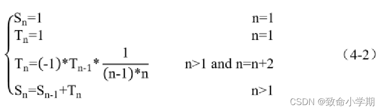 {float s=1.0f,t=1.0f;int n;printf("请输入计算项数:");scanf("%d",&n);for(int i=3;i<=2*n-1;i+=2){t= -t*(i-1)*i;//计算分母 s=s+ 1/t;}printf("s=%f\n",s);