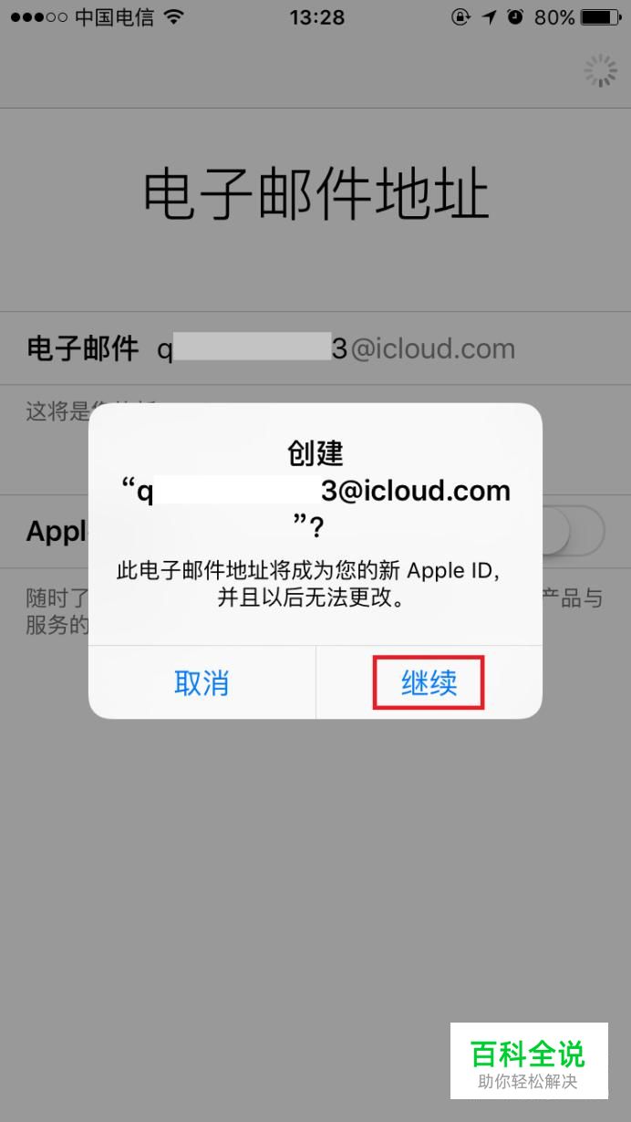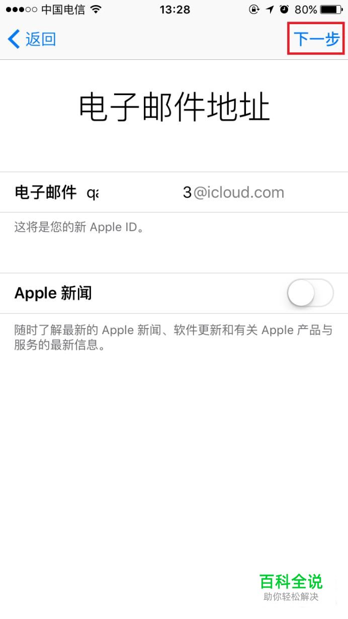 输入一个电子邮件地址,也就是Apple ID账号,点击右上角的“下一步”。