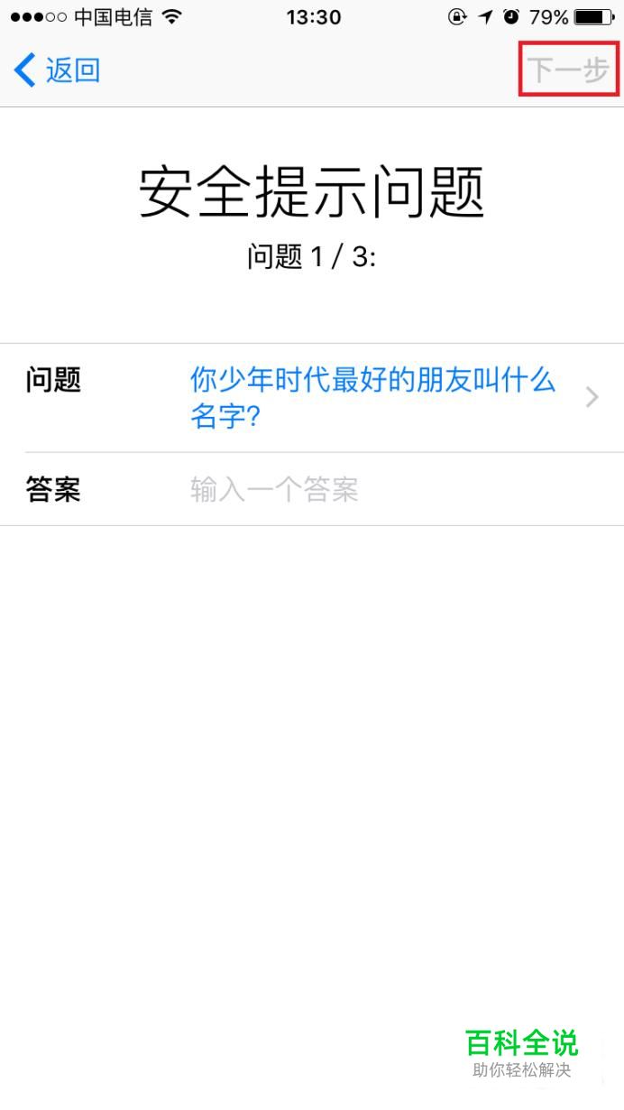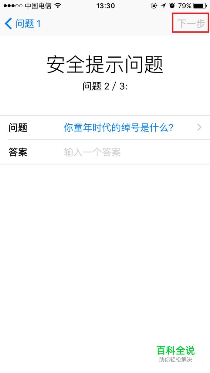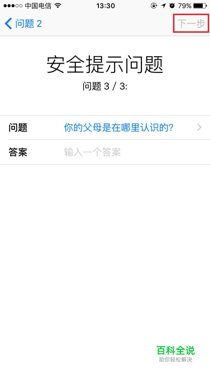 第三个问题同样选择适合自己的一个问题,输入答案后点击右上角的“下一步”。