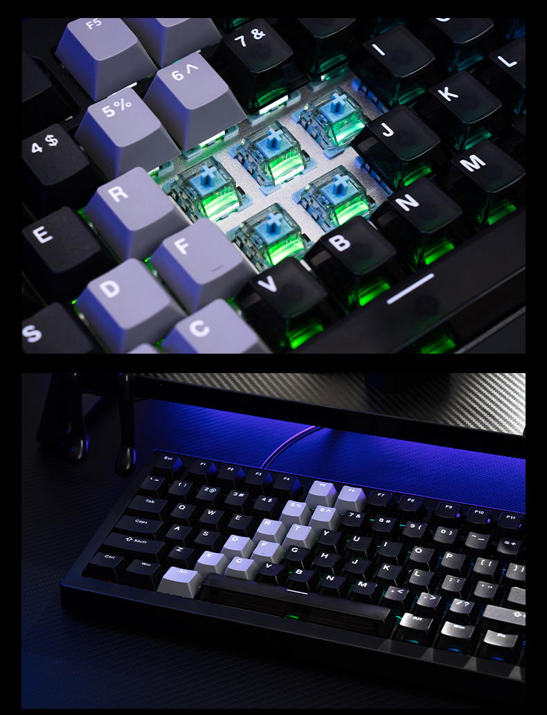 Akko 5075 V3 HE / 5087 V3 H3 键盘分别采用 75% 和 80% 配列,其模块化设计支持用户更换方案、键帽、轴体、壳体。这两款产品原装拥有工程塑料机身,内采用 Gasket 垫片固定,定位板基于铝合金材质,配备 ARGB 下灯位背光。