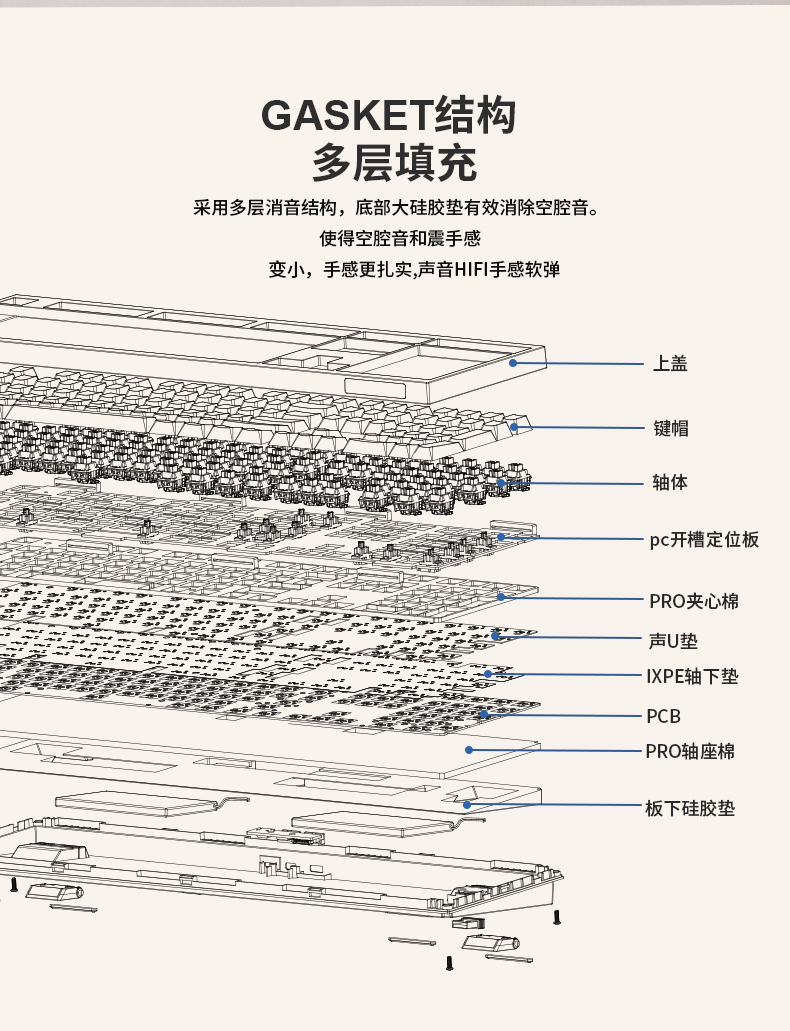QK108 键盘外壳为晒纹 ABS 工程塑料材质,内部搭载 PC 定位板并采用 Gasket 垫片固定。其内部拥有包含夹层乳胶棉、IXPE 轴下垫、PET 优声膜、底部海绵、底部硅胶的五层填充,PCB 支持轴体热插拔并搭载下灯位 RGB 背光灯珠。