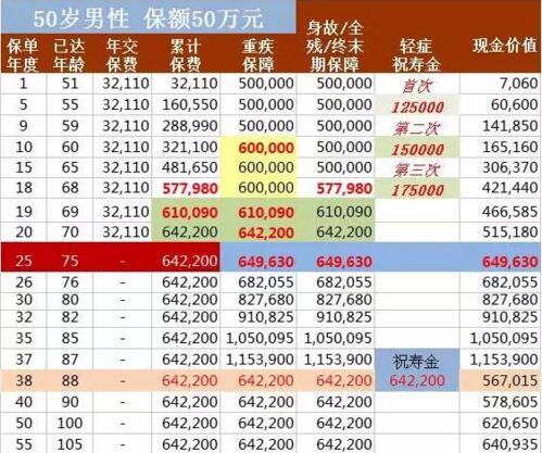 以50岁男性,投保华夏福基本保额50万元,交费期间20年,年交保费32110元为例: