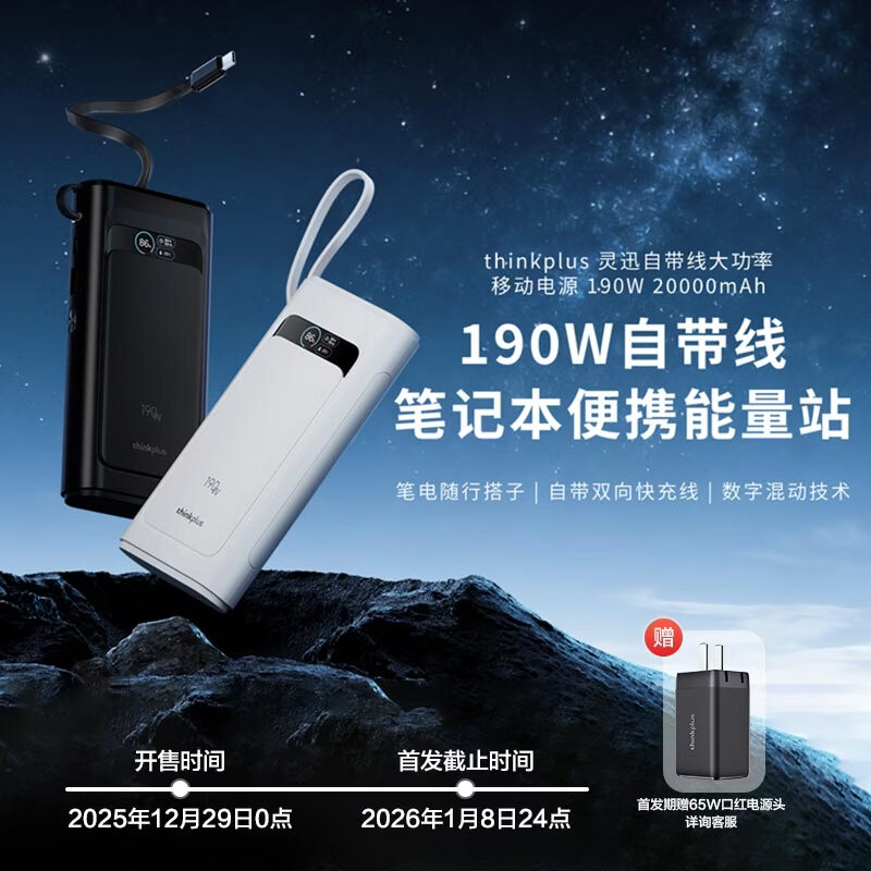 12 月 26 日消息,联想现已推出一款 thinkplus 灵迅自带线移动电源,该产品内置 20000 毫安时电芯,提供 190W 功率,采用 2C + 1A 设计,定价 259 元,将于 12 月 29 日开售,2026 年 1 月 8 日 24 点前购买可获赠 65W thinkplus 充电头。