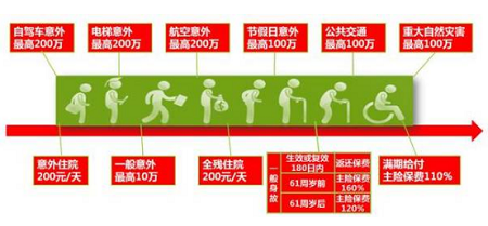 意外保障全面,包括自驾车、节假日、电梯、公共交通、一般意外、重大自然灾害和航空意外,全方位保障出行。